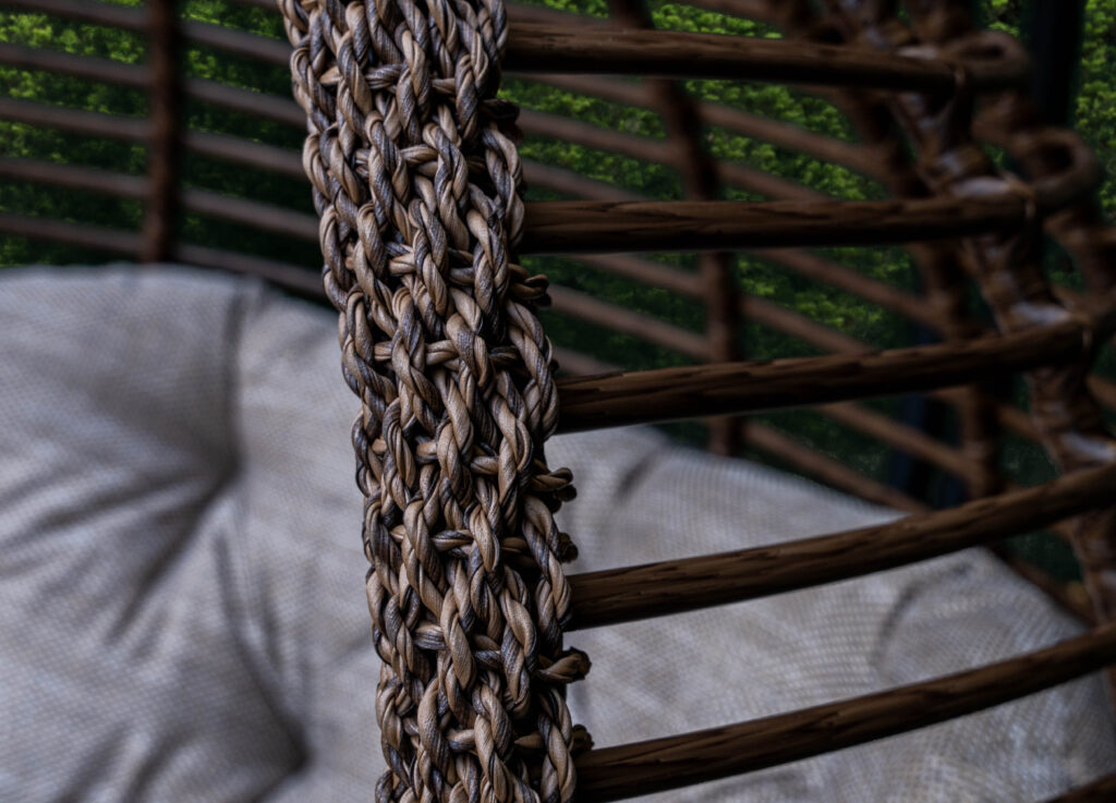 Замовляючи крісло Дабл Смугастий Преміум у нас, можете не сумніватися у відмінній якості меблів. Ця модель виготовляється з якісної сталі, яка покривається порошковою фарбою. Також варто відзначити унікальне плетіння у вигляді горизонтальних секцій. Для цього використається штучний ротанг. Це дуже практичний та довговічний матеріал. Крісло кокон з ротанга здатне простояти на вулиці цілий рік, при цьому він не втратить свого первозданного вигляду.