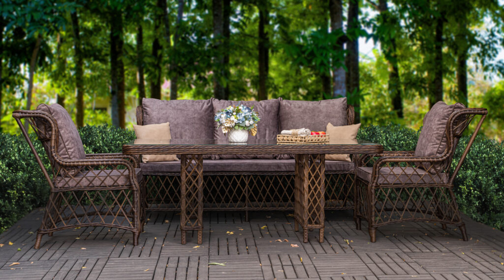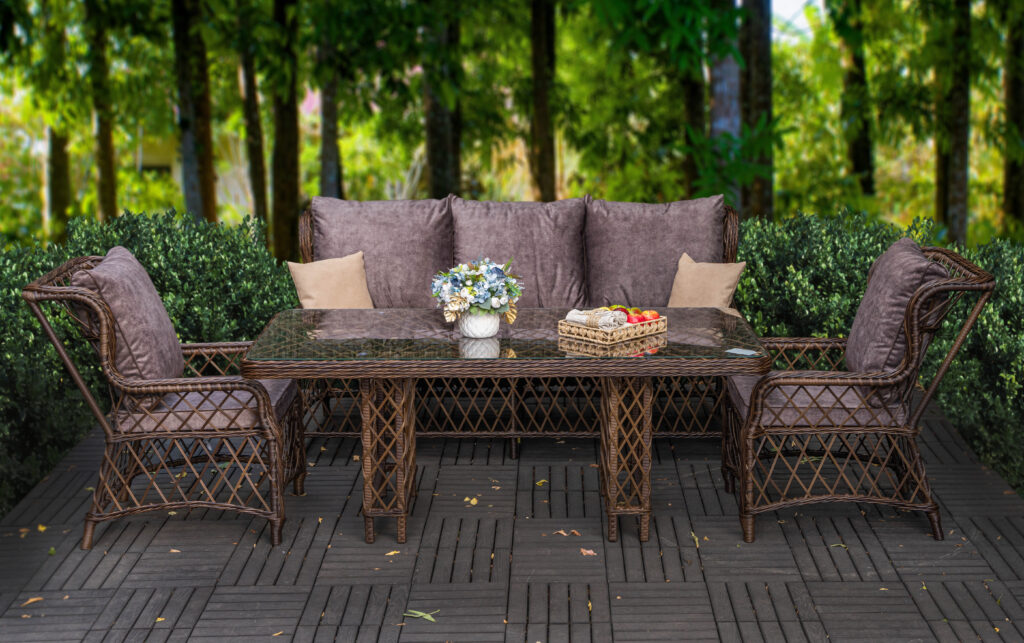 сверху каркас оплетается искусственным ротангом, который отлично переносит активную эксплуатацию мебели на улице;