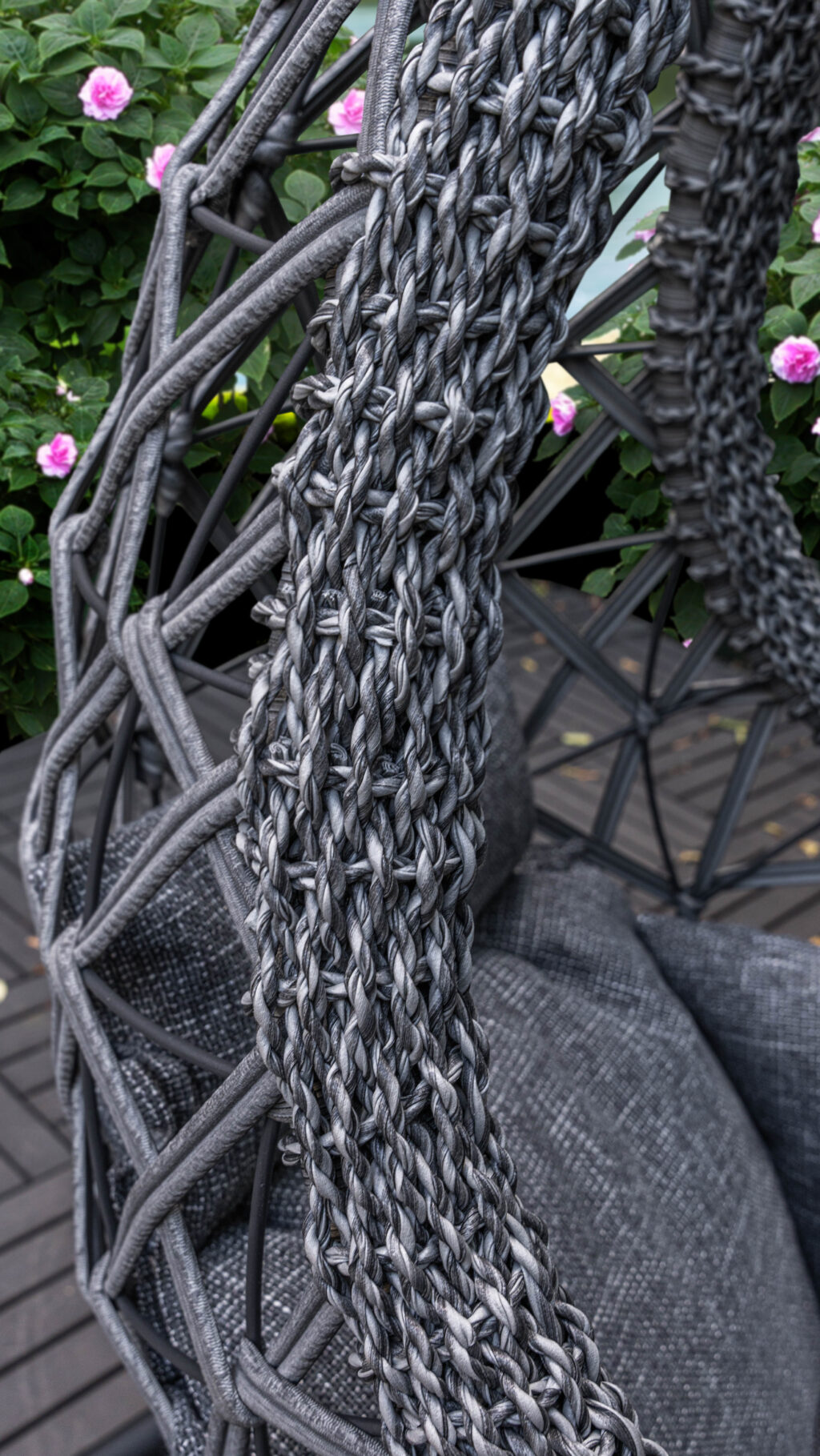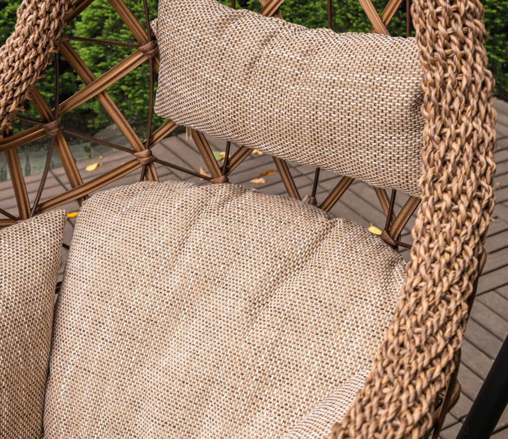 Основными преимуществами искусственного ротанга, которым заплетено кресло, является экологичность и долговечность.