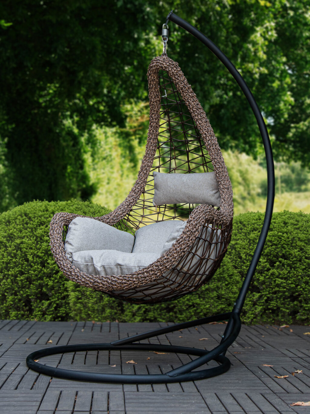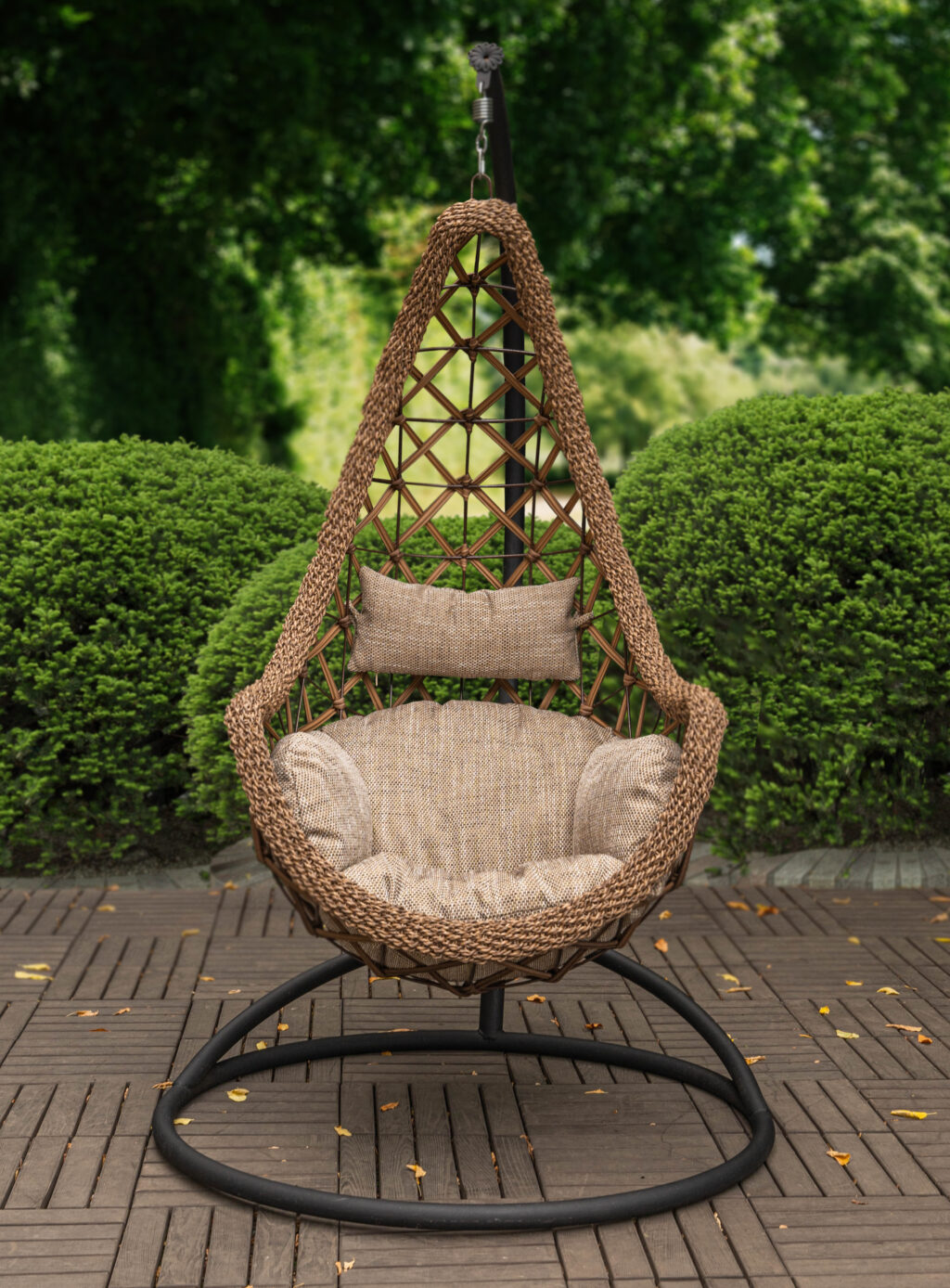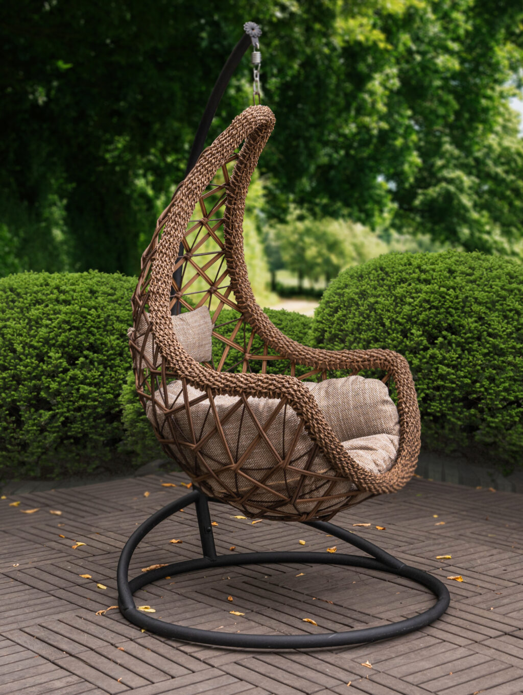 Подвесное кресло «Леди Премиум» изготовлено из искусственного ротанга, который не изменяется под воздействием влаги, снега, солнечных лучей и прочей непогоды.